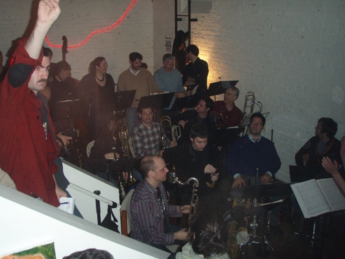 Argue’s greatest talent is his ability to create so many textures with a big band. Many compositions they performed used baritone saxophone, bass clarinet and bass trombone to create a heavy bottom groove while trumpets, clarinets and flutes created a complex and often mutli-metered interplay on top. Seconds later, 13 horns were holding a unison note for two minutes as a flugelhorn solo used every chromatic note to build tension. Immediately after the set, the migration began as the second event at Subterranean A was in only 90 minutes.